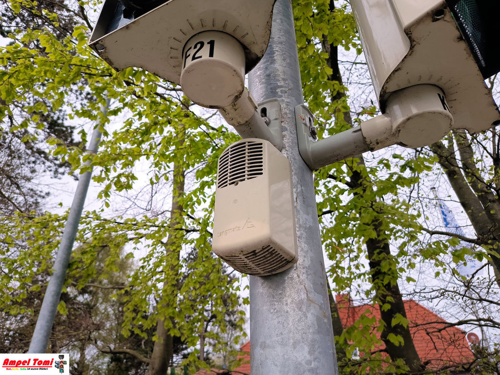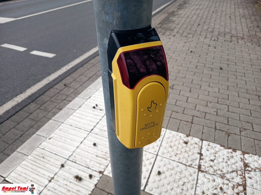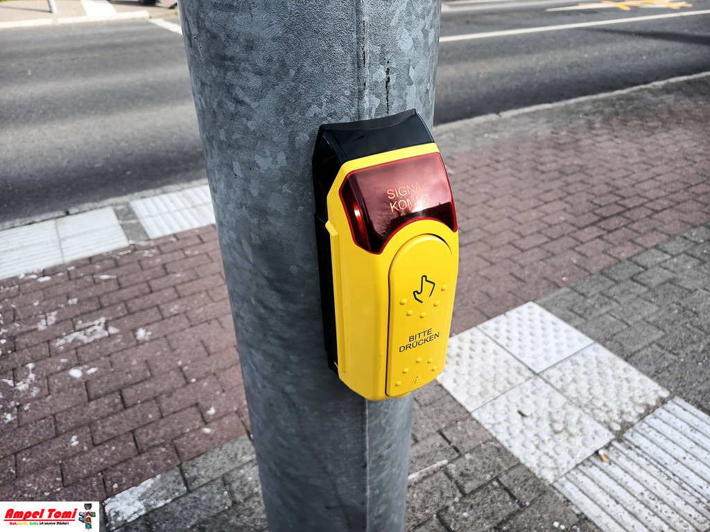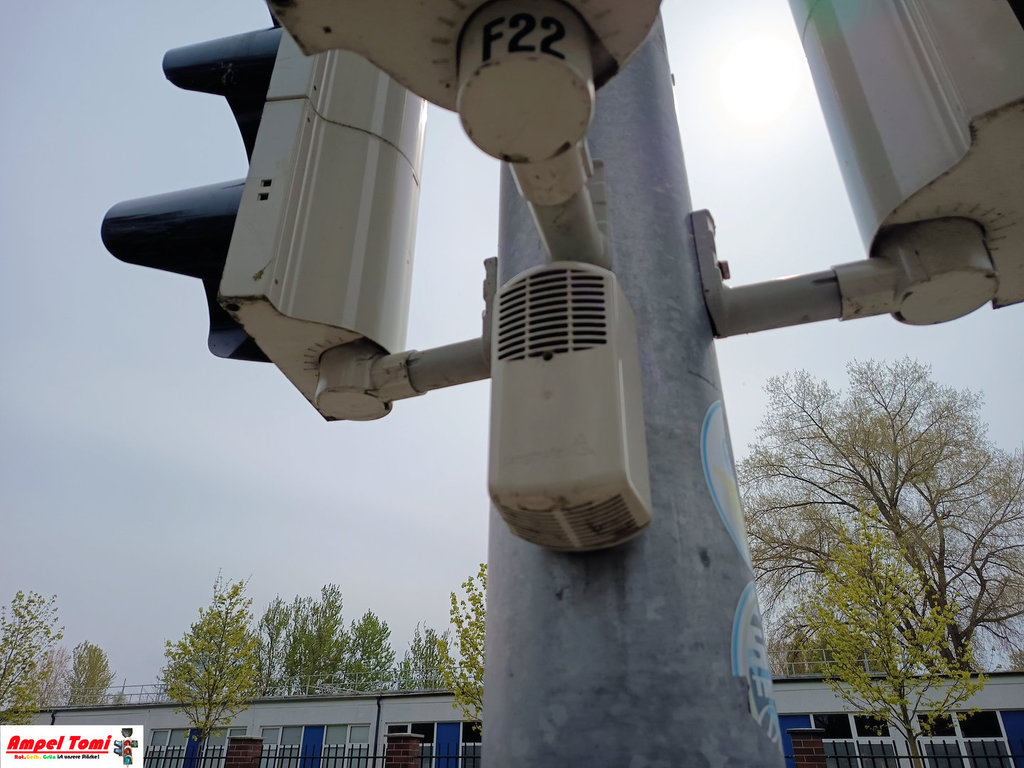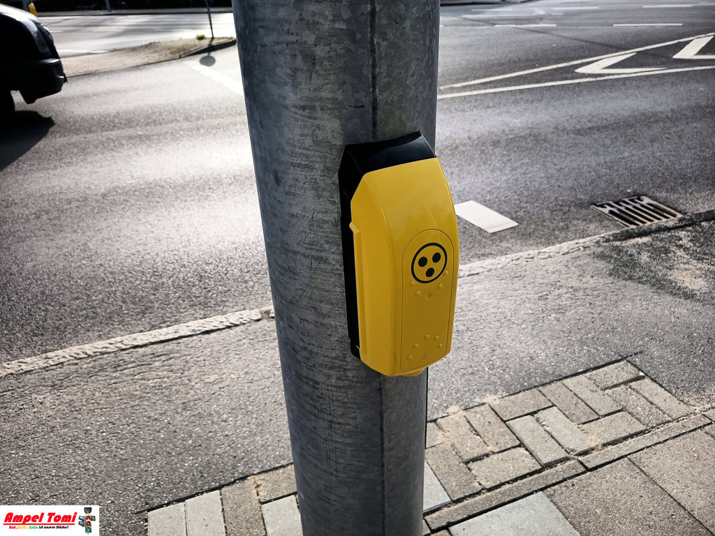 Mittlerweile ist diese Anlage zweifelsfrei als Swarco-Anlage identifizierbar. Ausgestattet ist sie mit kieselgrau-schwarzen Signalgebern des Typs Combia, Unterkategorie Ciway. Die Taster und Blindenakustik stammen diesmal einheitlich von Langmatz, Typ EK533 Crossguide. Besonderheit ist diesmal, dass die Signalgeber mit Farbscheiben ausgestattet sind.