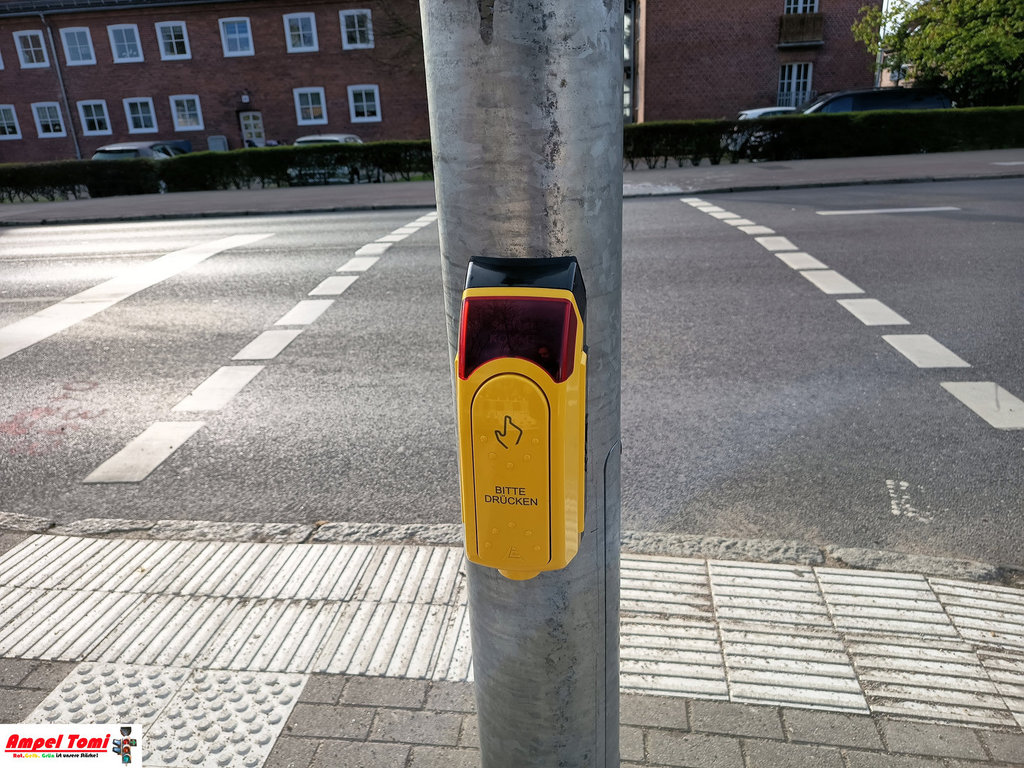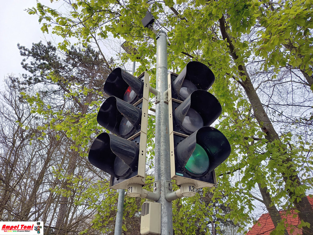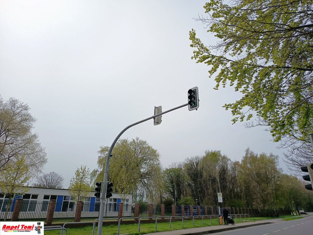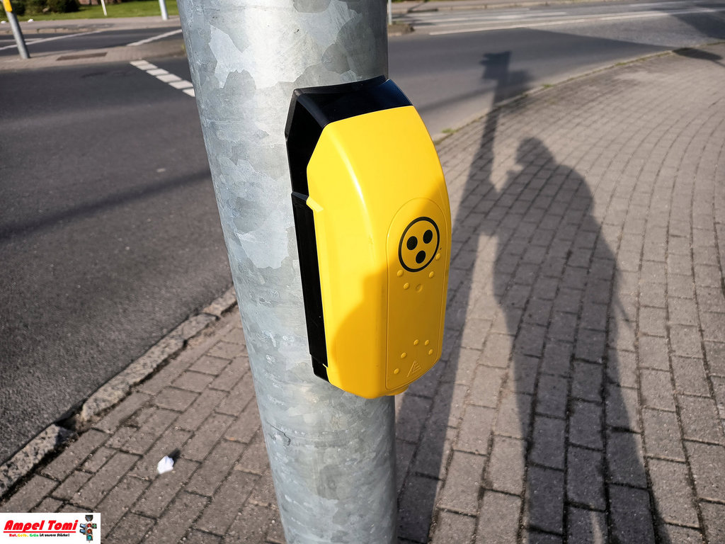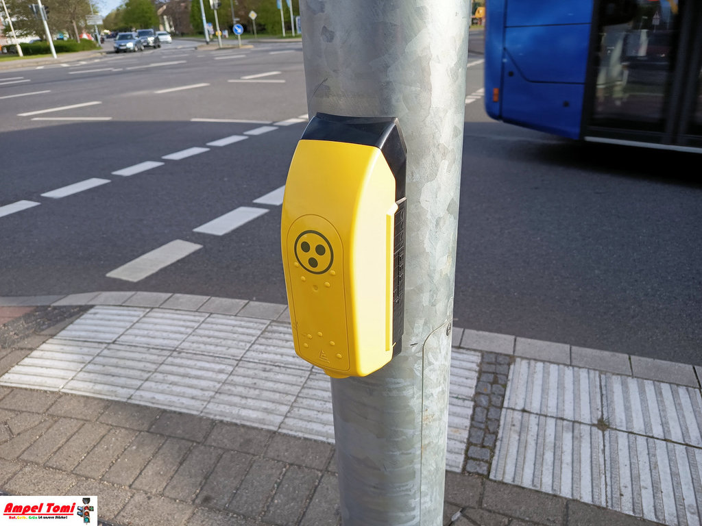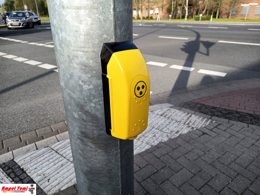Mittlerweile ist diese Anlage zweifelsfrei als Swarco-Anlage identifizierbar. Ausgestattet ist sie mit kieselgrau-schwarzen Signalgebern des Typs Combia, Unterkategorie Ciway. Die Taster und Blindenakustik stammen diesmal einheitlich von Langmatz, Typ EK533 Crossguide. Besonderheit ist diesmal, dass die Signalgeber mit Farbscheiben ausgestattet sind.