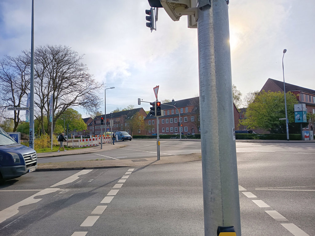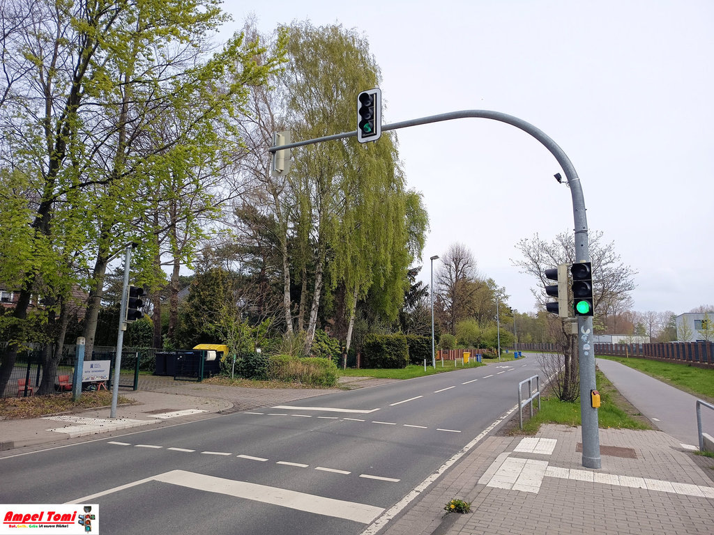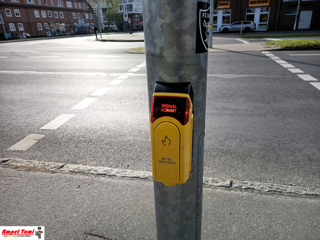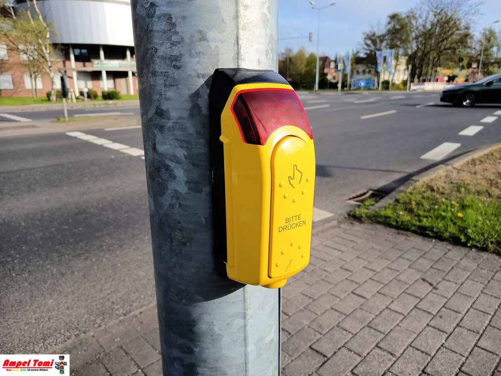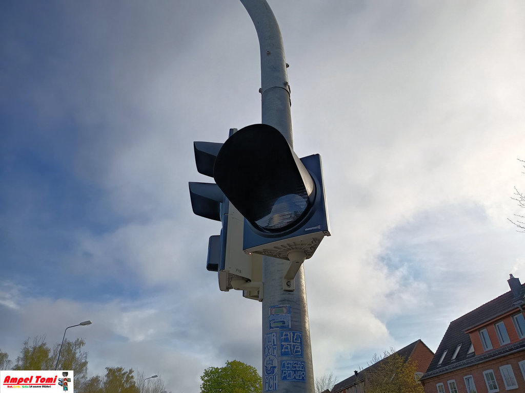 Mittlerweile ist diese Anlage zweifelsfrei als Swarco-Anlage identifizierbar. Ausgestattet ist sie mit kieselgrau-schwarzen Signalgebern des Typs Combia, Unterkategorie Ciway. Die Taster und Blindenakustik stammen diesmal einheitlich von Langmatz, Typ EK533 Crossguide. Besonderheit ist diesmal, dass die Signalgeber mit Farbscheiben ausgestattet sind.