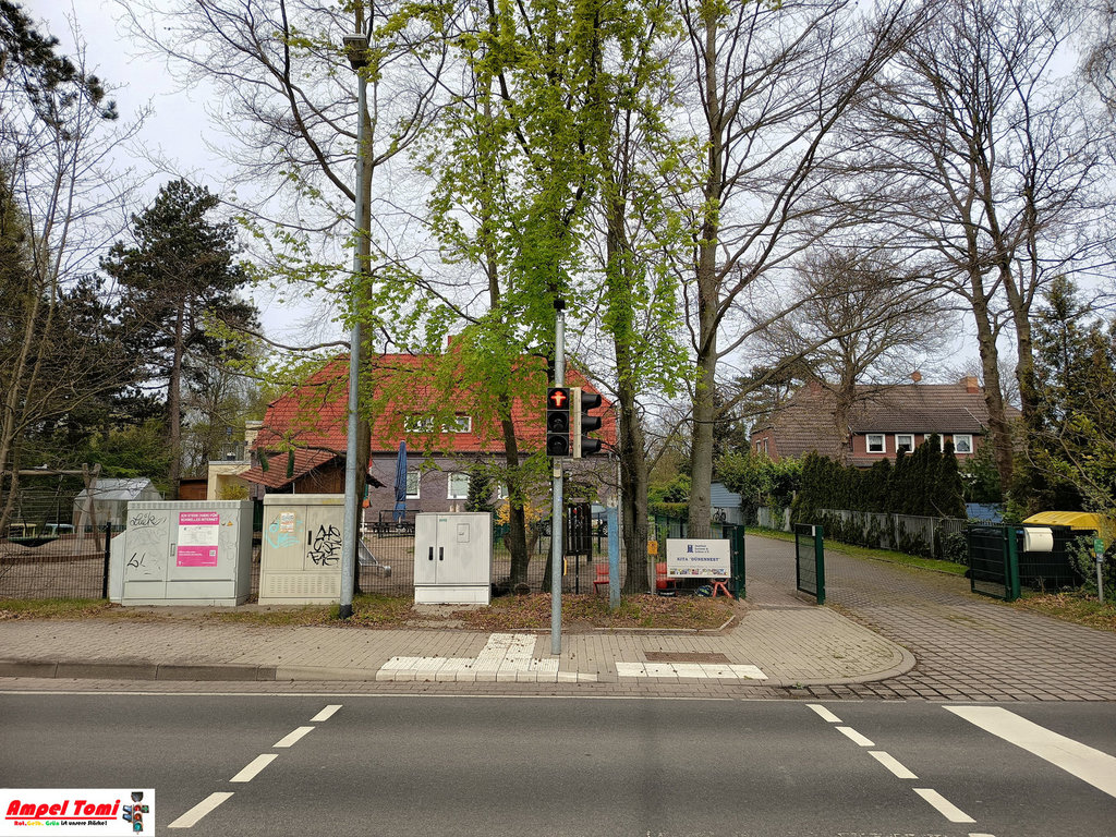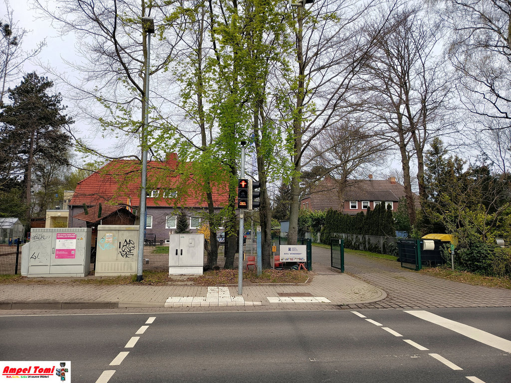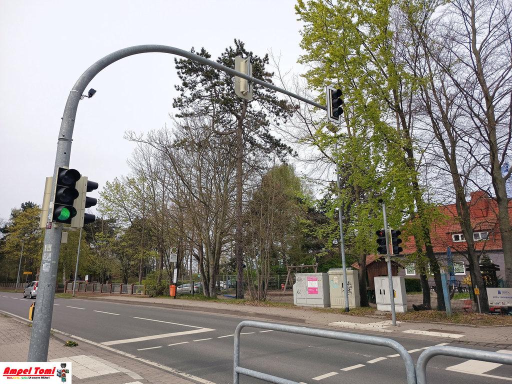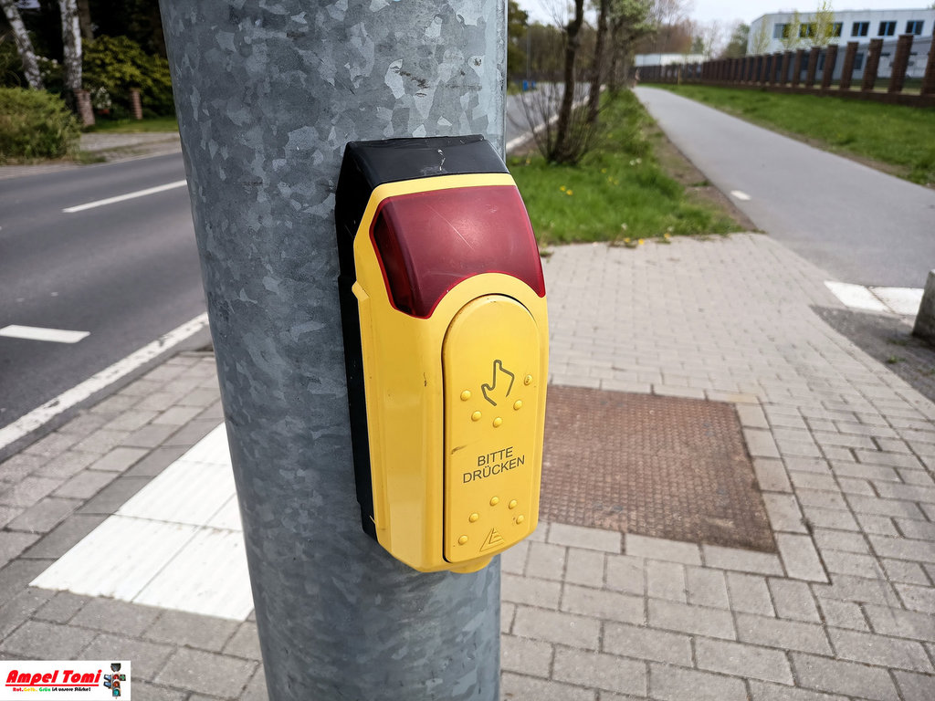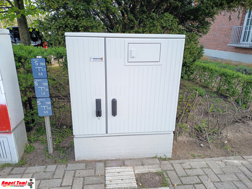 Am Ortsrand von Warnemünde, hinter dem Friedhof, befindet sich eine kleine FLSA, welche zwischen geschätzt 2019 und 2020 komplett erneuert wurde. Die Ausschreibung gewann hier Swarco. Nicht nur die Signalgeber und das Steuergerät wurde getauscht, sondern auch die Maste und ein neuer Standort für das Steuergerät wurde hergestellt. Die Ausrüstung weist mehrere Besonderheiten auf: zum Einsatz kommen die 2018 rausgekommenen Signalgeber des Typs COMBIA-Ciway aus dem Hause Swarco. Taster und Blindenleittechnik kommen hier von Langmatz, Typ Ek533 Crossguide, zum Einsatz. Interessant ist hier auch, dass die Quittierung in Gelb ausgeführt wurde, was in der Region häufig anzutreffen ist.