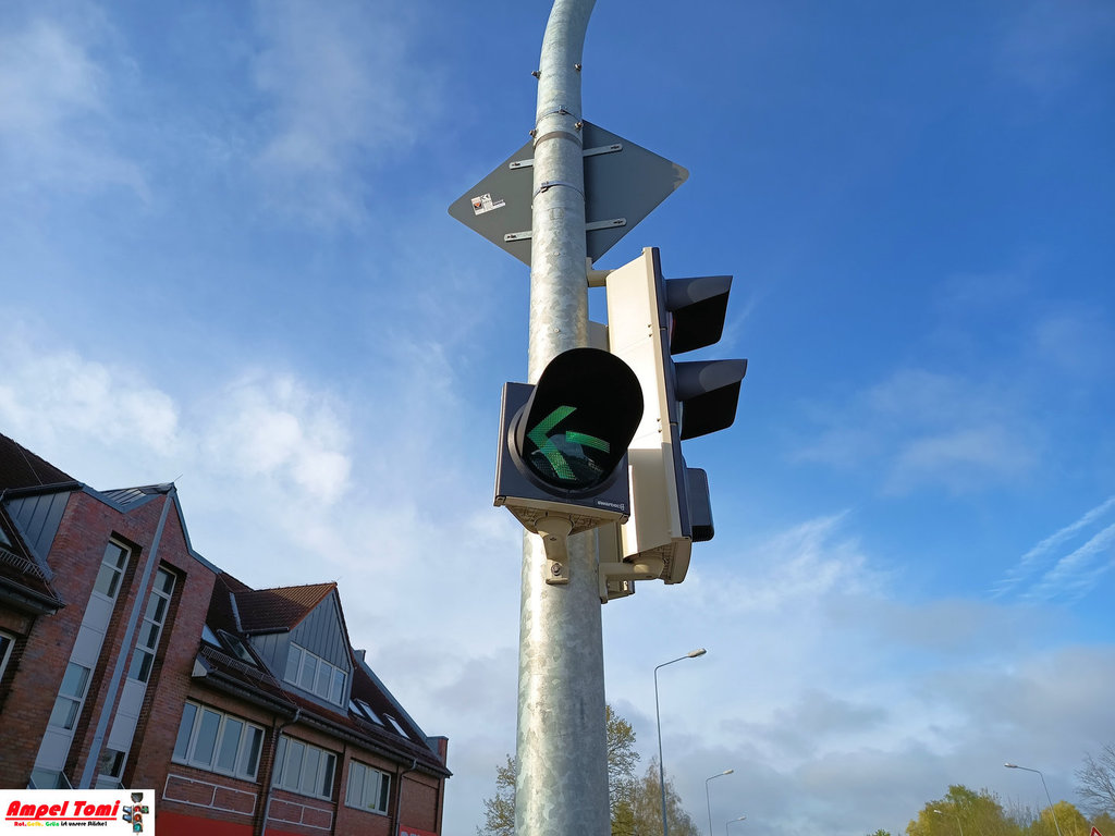 Diese Knoten-LSA kurz nach dem Ortseingang von Warnemünde wurde erst frisch saniert. Hier kommen Swarco Combia-Signale des Untertyps Ciway zum Einsatz. Auch sehr schön anzusehen, bzw. anzuhören die Blindenakustik und Anforderungstechnik des Typs EK533 Crossguide von Langmatz. Dennoch sind mit zwei Sachen an der Anlage negativ aufgefallen, so die Anordnung zweier Signale rechts neben dem Hauptsignal, wobei sich die 240er Arme als zu kurz erweisen und schlecht einsehbar sind. Desweiteren sind an einem Ausleger zwei Crossguide auf unterschiedlicher Höhe montiert, was leider die Optik der Anlage stört. Interessant hingegen, dass trotz Rückmeldung im Signalgeber, welche wieder gelb ausgeführt ist, die Taster dennoch eine eigene Rückmeldung haben.